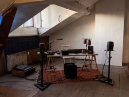 »Grounded Outer Space People« is a nomadic artist residency/music ensemble investigating the relationship between transmigration and music. Operating in a temporary studio the group of artists inhabits the gallery space and expands the exhibition-like frame through ensemble rehearsals, concerts, presentations, performances, sound- and visual works, and workshops. Upscaled scores and drawings extend over the gallery walls setting forth the launch of »Vostok 7« vinyl, a radio play conceived as a reenactment of the spaceship that has yet to be built. Driven through the perceptual shift from the visual to the sonic, the project operates a mobile sound system, a radio station, and a listening space full of musical instruments and sonic devices.